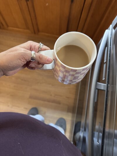 Sipping coffee in my ugly kitchen because I refuse to rush mornings—early rising is a hard pass.