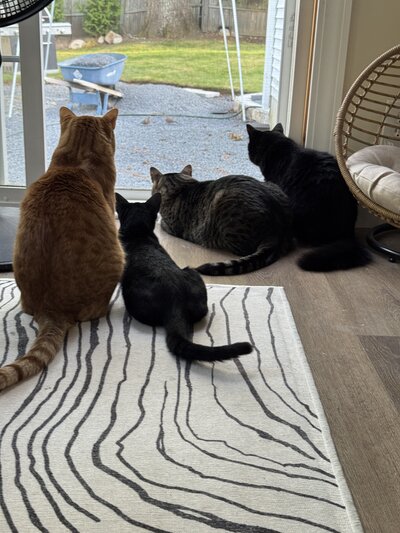 Letting my four cats have their daily "porch time" so they can stare out into the yard and plot against the squirrels.