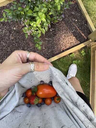 Picking tomatoes, peppers, and whatever else is ripe from the backyard garden fortress in growing season.